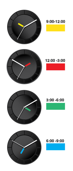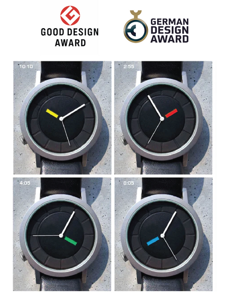 Jury statement: Although at first glance a simple watch, it succeeds in making visible the idea of invisible time. A day is not simply divided into twenty-four hours; the focus is on the change in the feeling of morning, evening, and night, and these feelings are expressed in colors. A disk with a slit, which serves as the hour hand, rotates, revealing the color behind the slit. Watches precisely tell time, but the fact that this one incorporates a poetic feel brings a smile to one's face.